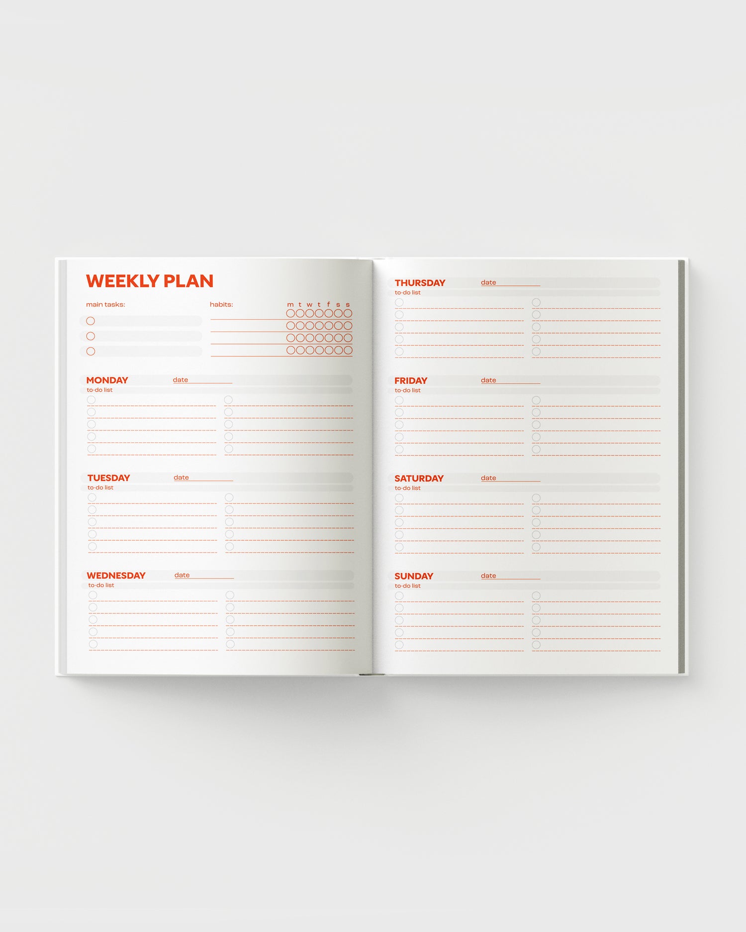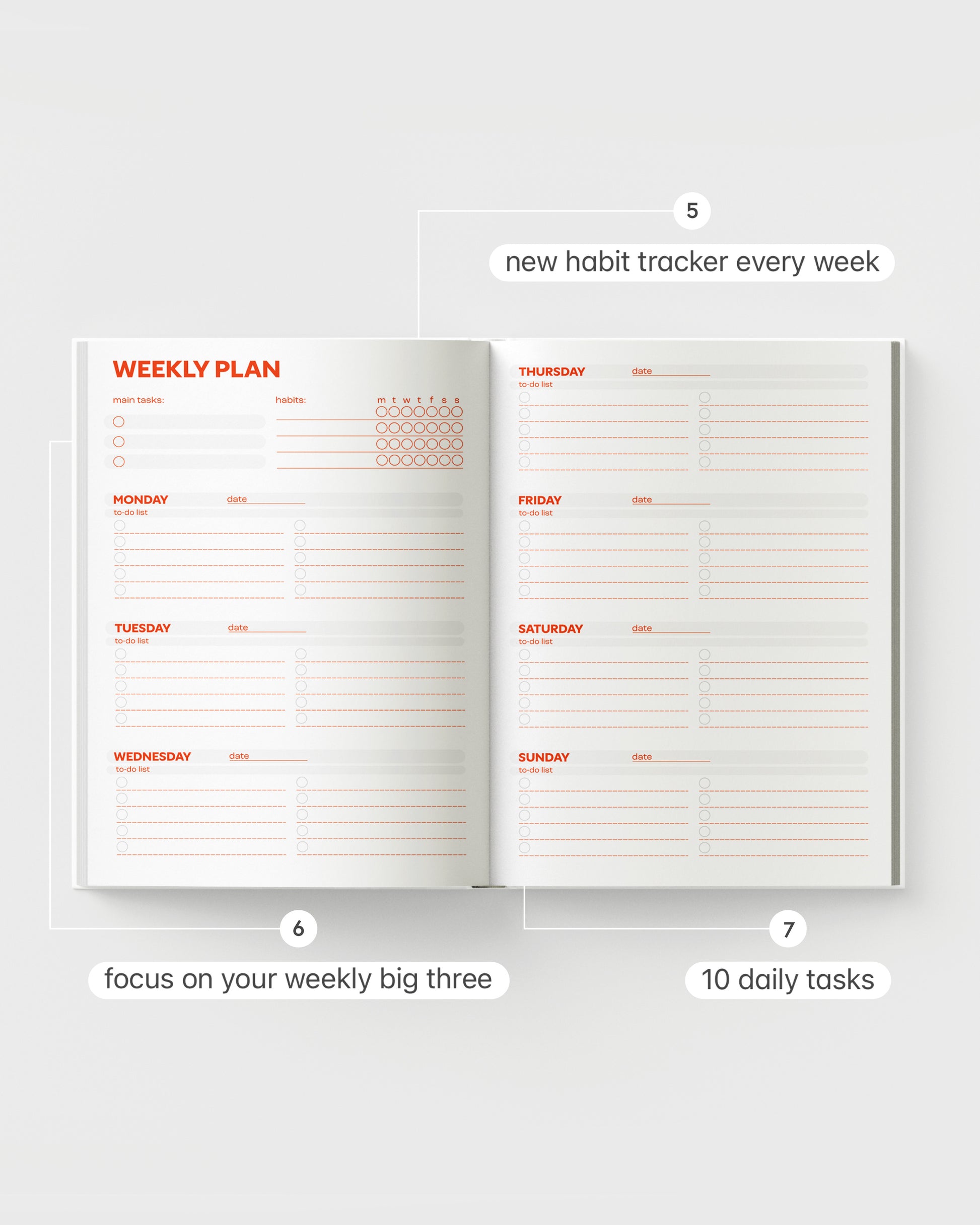 • 3 main tasks and habit trackers every week, 10 daily to-do lists