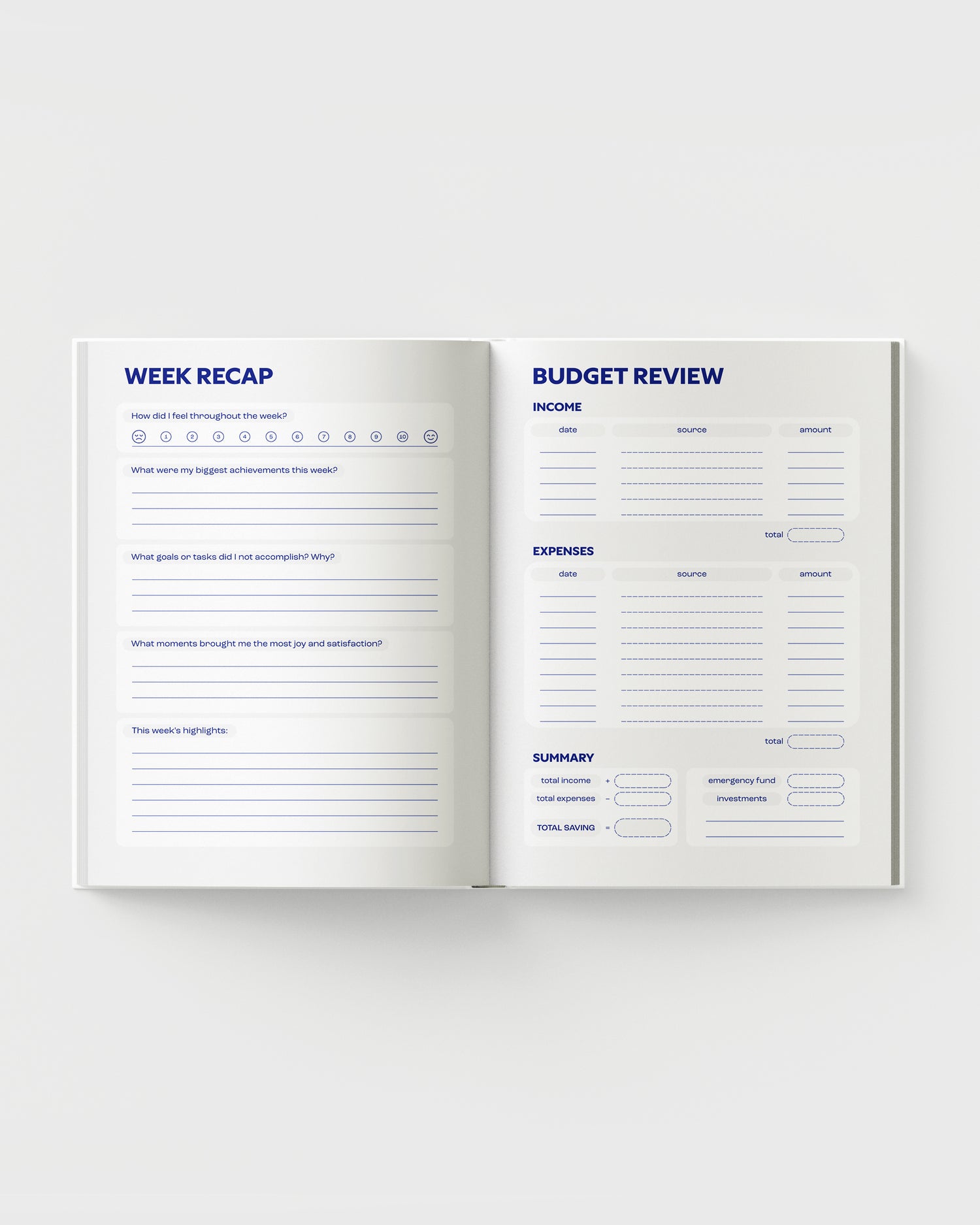 All in one: weekly tracker, budget tracker, notebook & sketchbook, self-reflection and self-discovery
